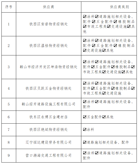 根據(jù)2024年5月11日發(fā)布的《供應(yīng)商入庫公告》要求,經(jīng)過報名篩選和資質(zhì)審查等程序,確定了9家供應(yīng)商符合入庫條件?,F(xiàn)公布經(jīng)過篩選的供應(yīng)商入庫清單,名單如下: